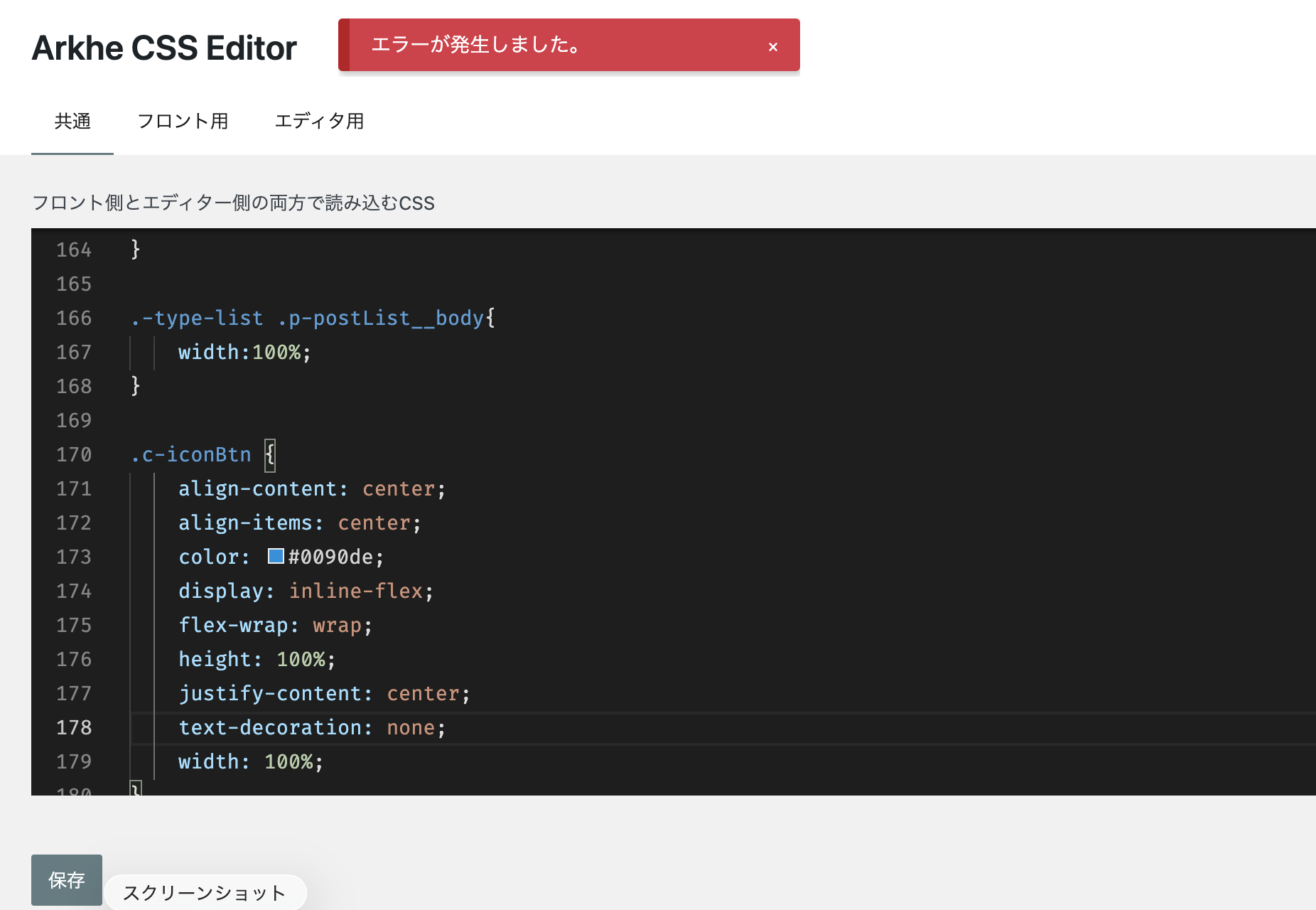 メニューナビゲーション:フォーラム履歴ログイン登録パンくずナビ:ForumArkheプラグイン: プラグインに関する質問Arkhe CSS Editor についてPlease ログイン or 登録 to create posts and topics.Arkhe CSS Editor についてnaknakm112投稿数 1#1 · 2026年2月10日, 8:20 AM引用元 naknakm112 2026年2月10日, 8:20 AM中久しぶりにコードを追加しようと思い、少しだけ修正して、保存しようと思ったらエラーが出ましたという赤い文字が出て、何も変更できません。 久しぶりにコードを追加しようと思い、少しだけ修正して、保存しようと思ったらエラーが出ましたという赤い文字が出て、何も変更できません。 アップロードファイル: 返信: Arkhe CSS Editor について キャンセル